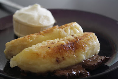 Vandeni imaisyti i kiausini, tada sudeti miltus ir ismaisyti. Banana perpjauti per puse ir sudeti i tesla. Ikaitinti keptuve, tada ipilti alieju, kepti kol parus. Patiekti su ledais ir sokoladu.
